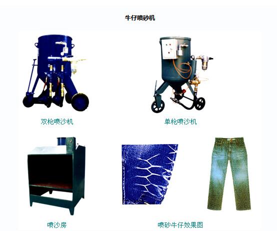 1.牛仔噴砂機是空壓機的壓縮空氣為動力,用噴槍將金剛砂直接噴射到牛仔褲上,使牛仔褲起到粗化、發白的效果。并可用模板制成顧 客需求的美麗圖案進行噴砂。完成一件牛仔褲僅需幾秒鐘時間。本機結構合理,操作方便,成本低、產量大。廣泛適用于國內各中小型服裝廠使用。