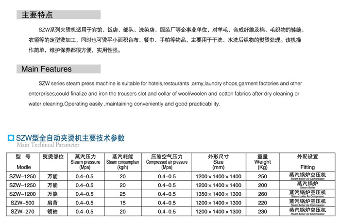 SZW系列夾燙機適用于賓館、飯店、部隊、洗染店、服裝廠等企事業單位,對羊毛、合成纖維及棉、毛織物的褲縫、衣領等的定型燙加工,同時也可燙平小面積臺布、餐巾、手帕等物品,主要用于干洗、水洗后織物的熨燙處理。該機操作簡單,維護保養都很方便,實用性強。